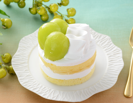 皮ごとおいしく食べられるシャインマスカットをトッピングしたショートケーキとなっています。ふんわりとしたスポンジに白ぶどうで風味よく仕上げたソースをサンドし、北海道産生クリームを使ったブレンドクリームでデコレーションしました。