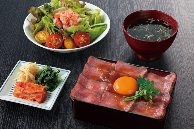 黒毛和牛を使用した特製ローストビーフはしっとりやわらか。卵をとろりと絡ませながら食べるもよし。ズワイガニのサラダやキムチとナムルの盛り合わせなど副菜付きでボリューム満点。