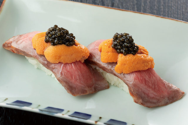 黒毛和牛特製ローストビーフの握り 生うに・キャビアのせ