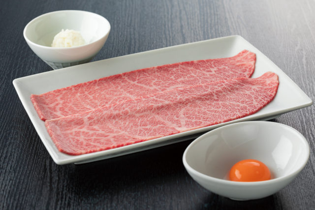 焼肉チャンピオン名物の『ざぶすき』は肩ロースの最高部位「ざぶとん」を使用した一品。ひと口目は特製割り下のかかったお肉を「まんげつ濃厚卵」に絡めて。ふた口目は一口サイズのごはんとともに。