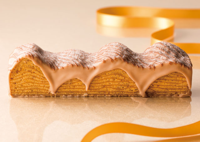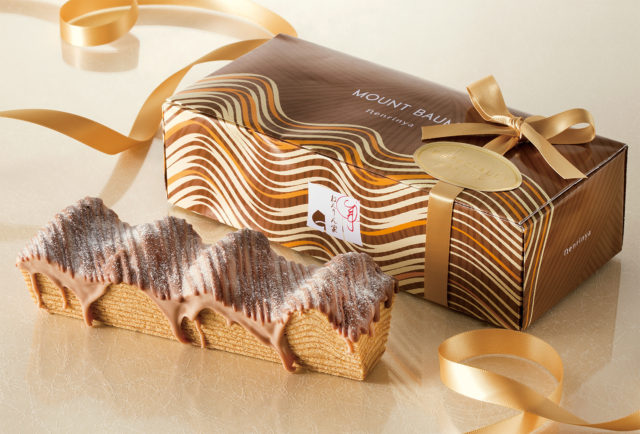 栗づくしの特別なこの一品のために、専用の特別箱をデザインしました。テーマは、「秋色に色づく、おいしい山並み」。バームクーヘンに流しかけたショコラとパッケージのラインがリンクしています。オータムゴールドのリボンのアクセントで上品に仕上げました。