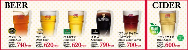 株式会社ハブが運営する英国風PUB「HUB」全店(浅草店を除く)では、毎日オープンから19:00まで※実施している、カクテル50種類以上が半額になるタイムサービスの「HAPPY HOUR(ハッピーアワー)」において、10月1日よりビールとドラフトサイダーも値引きします。