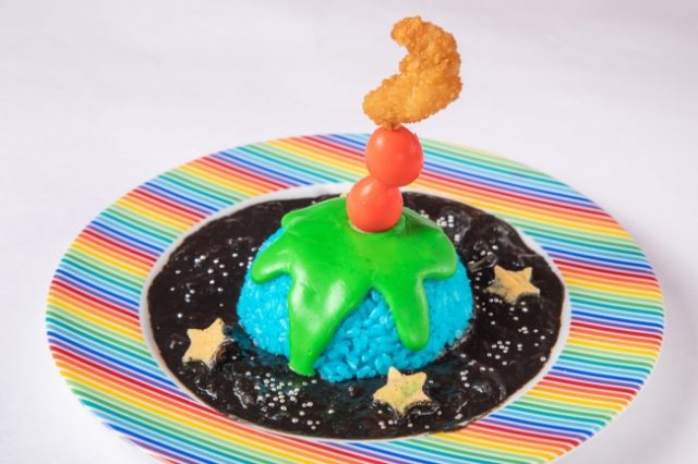 地球をイメージしたブルーライスの上には森に見立てたチーズがたっぷり。地球の中にはみんなが大好きなハンバーグが。暗闇の宇宙をイメージしたハッシュドビーフと一緒に食べることができるようになっています。