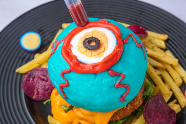 真っ赤な目玉のブルーバーガーに照り焼きチキン、チェダーチーズをたっぷり挟んだカラフルポップバーガー「目玉Monster」。真っ赤なチリソースをバンズに注入。