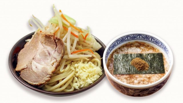 三田製麺所の特製豚骨魚介スープをベースに、甘みとコクたっぷりの背脂を加えた超濃厚スープ。 麺は並・中・大が同一価格で選べるようになっています。「肉野菜盛り」や「肉マシ野菜盛り」には、麺の上にゆで野菜(もやし、キャベツ、人参)とチャーシューがトッピング。いずれも刻みニンニクが豪快に盛り付けられており、食欲を刺激する一品となっています。