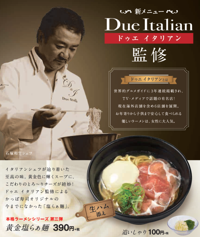 『黄金塩らぁ麺』は、世界的グルメガイドに3年連続で掲載された話題の有名店「ドゥエ イタリアン」が全面監修した新メニューです。普段はラーメンを注文しない人にも食べてもらいたいという想いで、幅広い世代に人気の高い“チーズ”に着目。チーズを使ったクリーミーなラーメンで人気を博す「ドゥエ イタリアン」と出会い、本格ラーメンシリーズ第3弾としてコラボレーションに至りました。