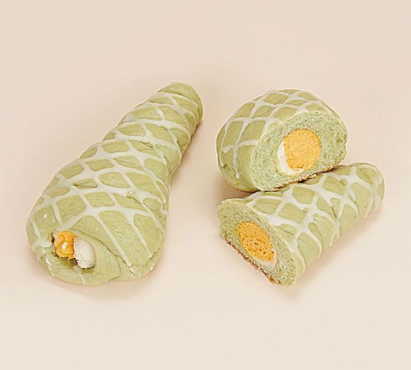 内容:メロン風味豊かなコロネ状のパンに、メロンホイップとミルクホイップを絞りました。パンの表面に格子状のシュガーコーティングをすることで、メロンをイメージした形に仕上げています。見た目もかわいい、楽しいコロネとなっています。