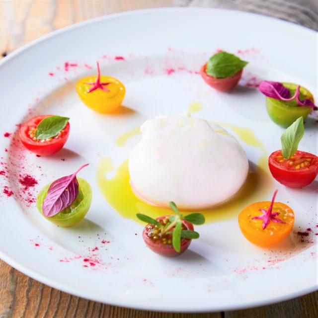 店内で毎日手作りしたモッツァレラチーズの中に独自で開発したピンクの色のストラチャテッラを詰めたフレッシュなブラータを開発。真っ白でつるんとした生地の手作りブラータにナイフを入れると、ピンクのとろっとしたストラチャテッラが流れ出し、口に入れると、さっぱりとしながらもリッチでクリーミーな味わい。味わいも見た目もインパクトのある1品に仕上がっています。