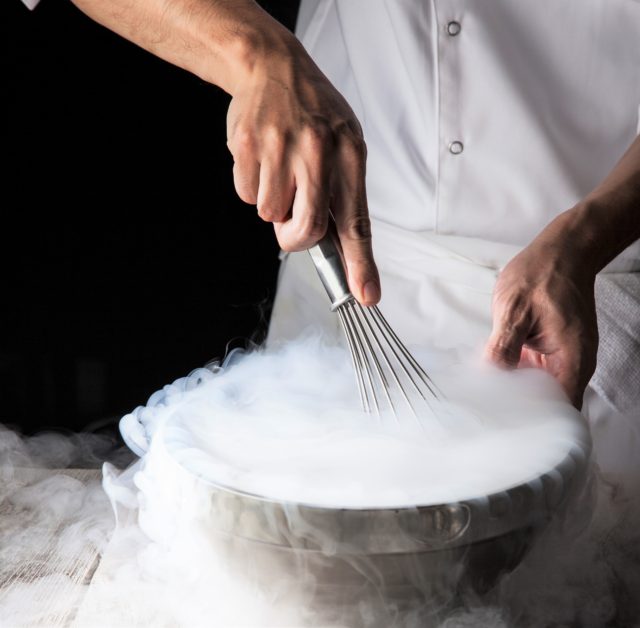 マイナス196℃の液体窒素をマスカルポーネとフロマージュブランをあわせたクリームの中に入れて、お客様の目の前で仕上げるシャーベットアイスです。