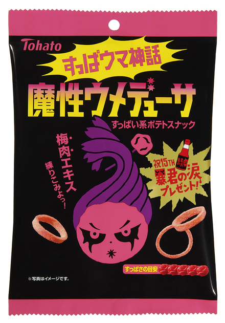 「魔性ウメデューサ」は、今年発売15周年を迎える、激辛トウガラシ・ハバネロを使った刺激的なウマ辛ポテトスナック「暴君ハバネロ」シリーズの新商品です。梅肉エキスを生地に練りこみ、梅エキスパウダーで味つけし、さらに昆布とかつおの旨味、甘味を加えて、あとひきのあるすっぱウマい味わいに仕上げました。