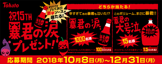 なお、「暴君ハバネロ」生誕15周年を記念し、2018年10月8日より12月31日まで、辛すぎてあの暴君も泣いた!?オリジナルハバネロ激辛ソース「暴君の涙」などが当たる「祝15TH暴君の涙プレゼント!キャンペーン」を実施します。