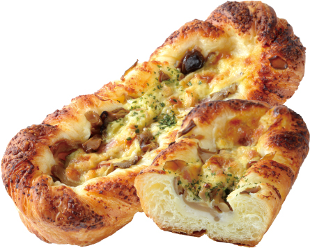 デニッシュ生地にホワイトソース・4種のきのこ・ベーコンをのせ濃厚なカルボナーラソースを絞って焼きあげました。