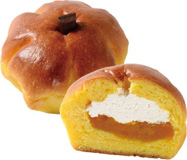 かぼちゃペーストを配合した生地に、かぼちゃ餡を包み、ホイップクリームを絞りました。