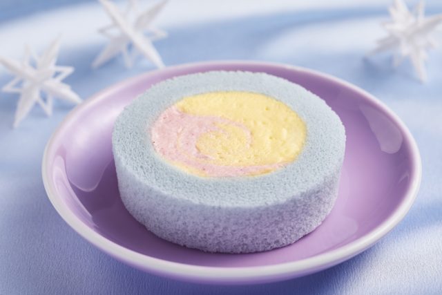 青色の生地の中心に、バニラ味のクリームといちご味のクリームを詰めたユニコーンカラーのプレミアムロールケーキとなっています。パッケージにもユニコーンを描き、「ゆめかわ」を表現しました。