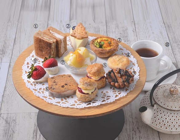 (1)ミニサンドウィッチ2種(スティルトン&チャツネ、ターキー&クランベリー) (2)クリスマスクッキーをのせたリコッタチーズケーキ(3)ミニキッシュ (4)ミニエクルズケーキ (5)ミニスコーン2個(ラズベリージャム&クロテッドクリーム、チリジャム&豆腐クリーム) (6)アールグレイアイシングのフルーツケーキ (7)ミニアップルカスタードトライフル (8)ホワイトチョコレートかけストロベリー2個(9)栗のミニタルト (10)紅茶またはコーヒー