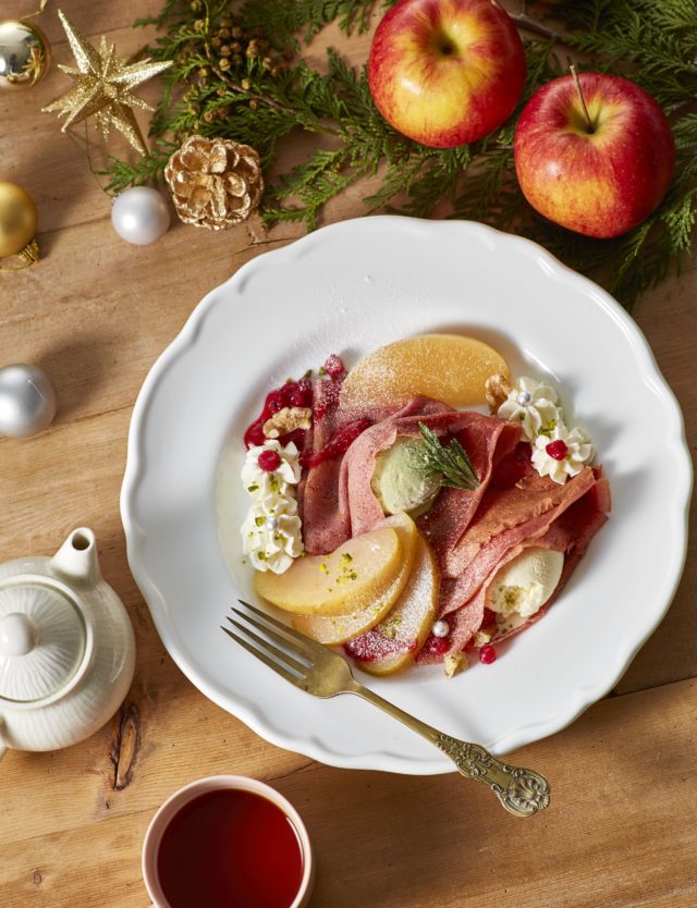 商品説明:ライ麦粉とタピオカ粉を合わせ、ラズベリーでピンクに仕上げたもちもち食感のクレープ生地に、ピスタチオアイスとまろやかなバニラアイスを合わせ、スパイスで煮込んだりんごのコンポート、レッドカラントのマリネ、クリームチーズホイップをトッピングしました。