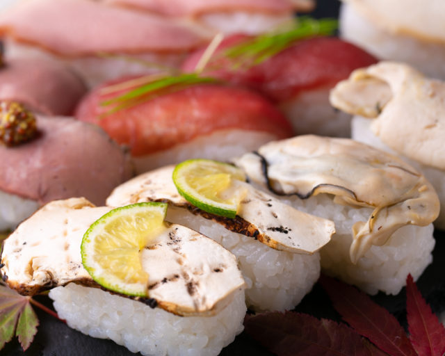 食べ放題内容は新潟和牛を使用した寿司や鴨肉などこだわりの肉4種類のお寿司に加え今が旬の牡蠣や松茸のお寿司まで食べ放題に。