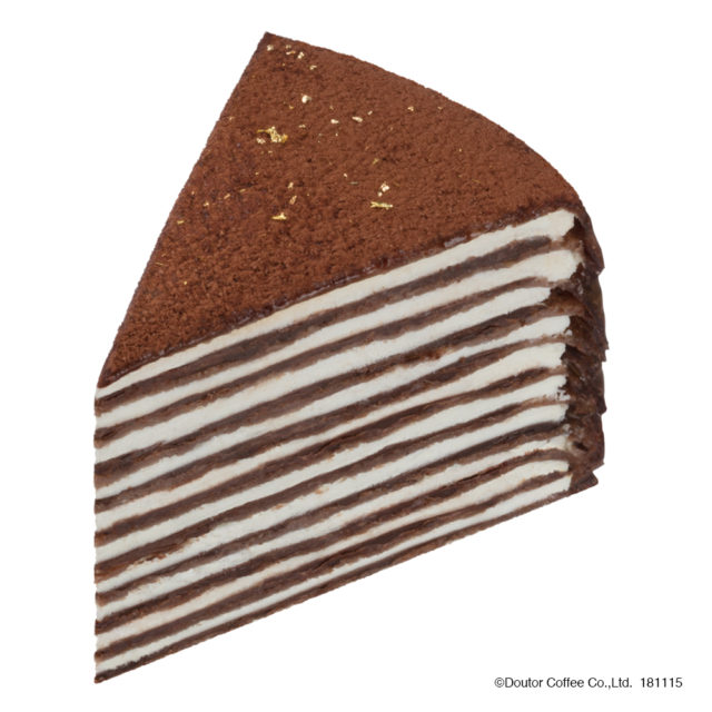 チョコとココアを練りこんだクレープ生地とホイップクリームを重ね、間にパリパリチョコレートを5層挟みました。表面にはココアパウダーと金粉をふりかけて、ビターな味わいに仕上げました。
