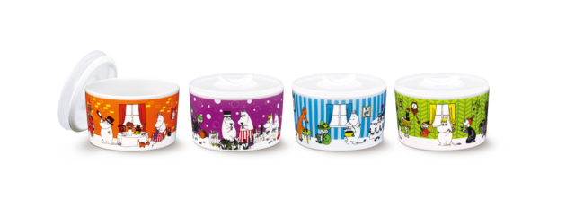それぞれ「ムーミン」と仲間たちがムーミンハウスの中でパーティーを楽しむ姿が描かれている、オレンジ、ブルー、グリーンと、希少なパープルの「限定デザイン」の計4種類となっています。冷蔵庫保管や電子レンジでの温めも可能なふた付きの便利な容器で、近年トレンドにある「作り置き」など色々な用途で食卓を楽しく彩ることができるようになっています。