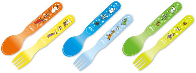 「スマイルセット」は、KFCの人気メニューにKFC特製グッズが付いた、子ども向けの楽しい商品となっています。今回のグッズは、「ケンタッキー限定 ムーミングッズ」の第1弾「ムーミン冬のスプーン&フォークセット」で、3種類からいずれか一つ、選ぶことができるようになっています。