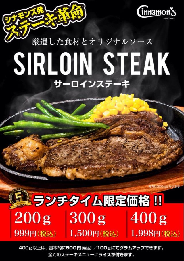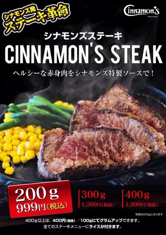 表参道の人気ハワイアンレストラン「シナモンズ」は、シナモンズ発の【ステーキ革命】を掲げ、10月29日“29(にく)の日”に、200g999円のステーキメニューの他3種類を発表しました。