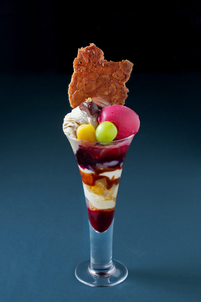 パフェの断面は全部で14層です。カシスソース、栗ムース、キャラメルソース、ラ・フランス、和栗、シャインマスカット、巨峰などを重ねていき、2種類のアイス、頂上にアーモンドチュールを乗せました。絶妙な甘みと酸味のバランスで、このボリュームでも最後までついついスプーンが進むような一品です。