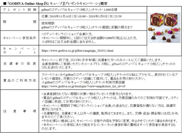 「GODIVA Online Shop 『G キューブ』プレゼントキャンペーン」は、ゴディバ オンラインショップ会員を対象にキャンペーン期間中、1回の注文合計金額が5,000円(税込)以上の人の中から、抽選で1,000名にゴディバ「G キューブ(9粒入)」チケットをプレゼントするキャンペーンとなっています。