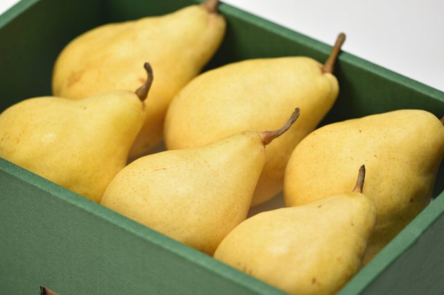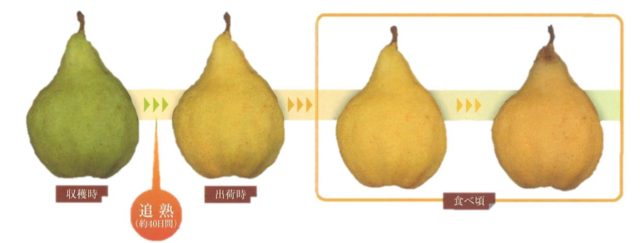 他の西洋なしと比べて追塾期間が長く、例えば、「ラ・フランス」の追熟期間は15~20日間ほどですが、「ル レクチエ」は約40日間の追熟期間を要します。10月中~下旬ごろからの収穫作業ののち10~15℃で管理することによって、表皮が緑色から山吹色に変化し、高い糖度ととろけるような果肉、独特な甘い香りが生まれます。