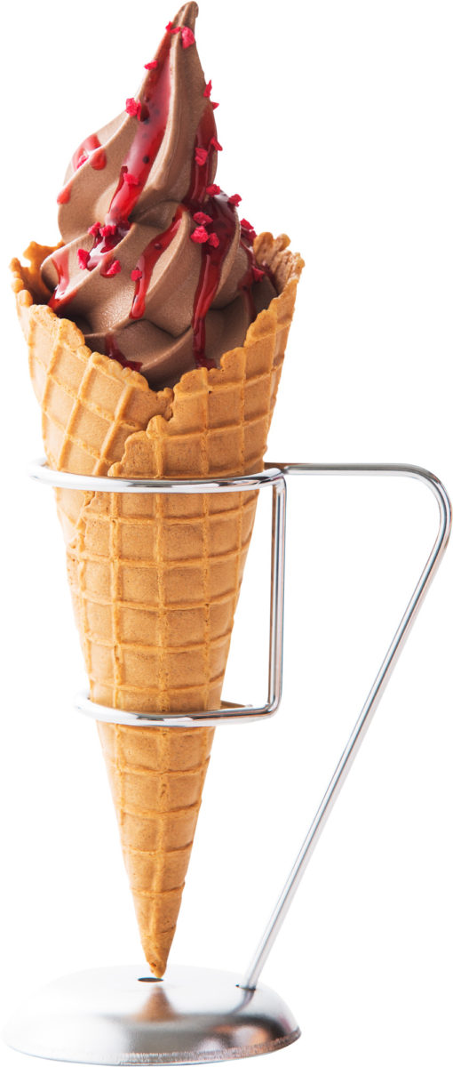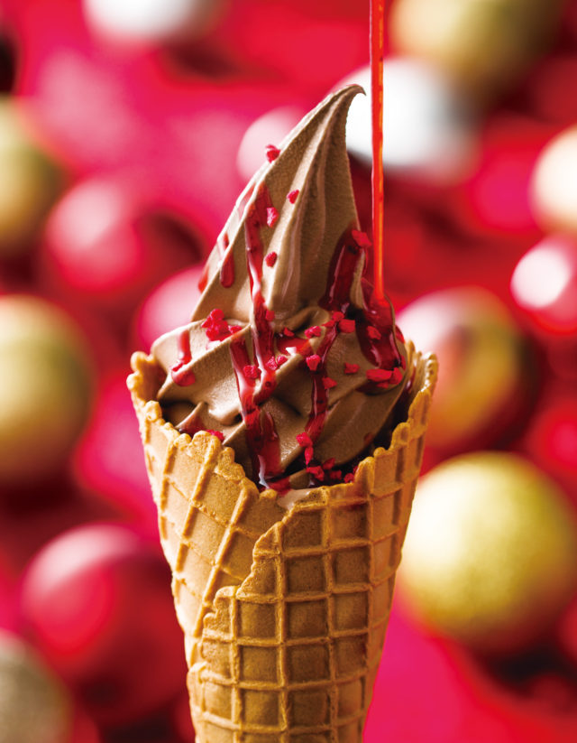 3種類のビターチョコレートとクリームチーズをあわせたソフトクリームに、果肉感のあるストロベリーピューレとフランボワーズのクリスピーをあしらいました。