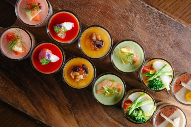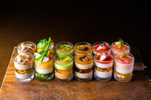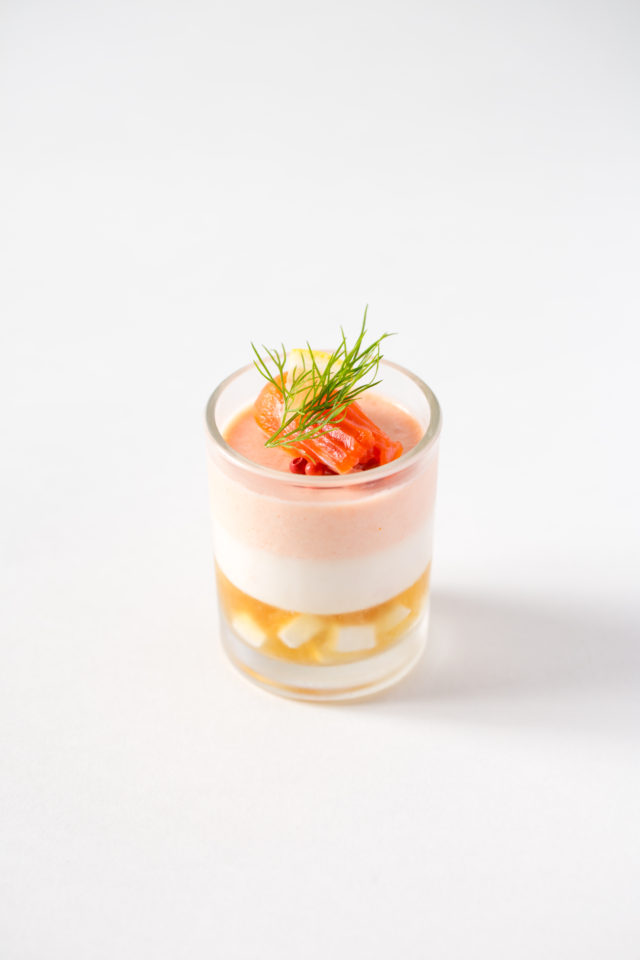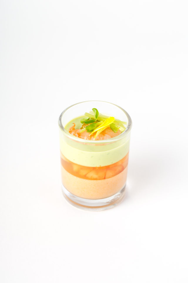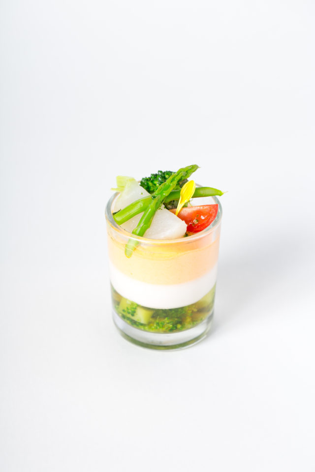 概要:小さなガラスグラスに入れて提供する「ヴェリーヌ」スタイルの「前菜」メニューを6種用意しました。異なる味わいの3層のムースやゼリーを重ね合わせて作っているのが特長で、バリエーション豊かで、繊細な味わいのハーモニーを楽しめるようになっています。同メニューは、レストランでシェフにより1個1個、数多くの工程を経て時間をかけて丁寧に作られています。メニューは通常提供は6種で、季節ごとにメニューをリニューアルしていく予定です。家庭では味わうことができない、レストランメイドだからこそ楽しめる特別な前菜となっています。