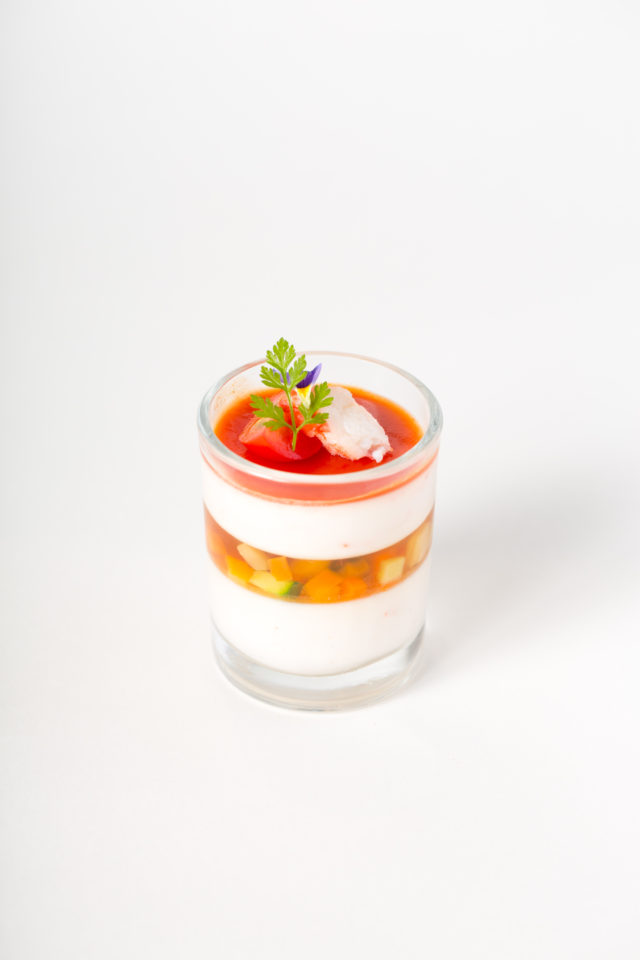 クラブ エ トマト…ズワイガニやトマトを使用したムースに野菜コンソメを重ねています。ズワイガニのコクとトマトの甘みと酸味の絶妙バランスを楽しめるようになっています。