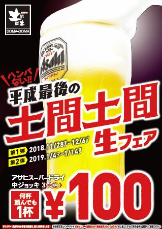 コロワイドグループの株式会社レインズインターナショナルでは「居酒家 土間土間」(全国146店舗 ※2018年11月1日時点)にて、第1弾として2018年11月28日(水)から2018年12月6日(木)、第2弾として、2019年1月4日(金)から2019年1月14日(月)の2回に分けて、何杯注文しても1杯100円で生ビールを提供する「土間生フェア」を開催します。