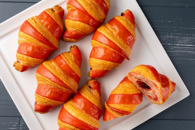 苺の濃縮シロップで鮮やかな赤色のクロワッサン生地をつくり、ストロベリーチョコを入れて焼きあげました。鮮やかな赤色と苺の香りが見た目も可愛らしいクロワッサンとなっています。