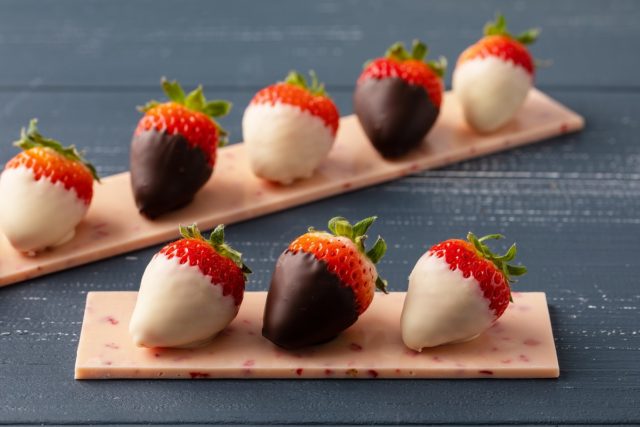 とちおとめ、さちのかなど5種類の苺からその日に状態の良い苺3種類をつかいチョコレートでコーティングしています。苺3種類を1つずつ、または3種類を2つずつのセットとなっています。