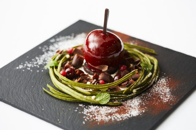 チェリーとチョコレートを使ったフォレノワール(黒い森)を セバスチャン風に仕立てました。抹茶のチュイールを添えて、味と見た目の両方にこだわったフォトジェニックなスペシャルデセールとなっています。