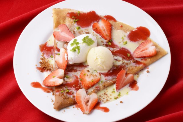 自慢のもちもちのクレープ生地でカスタードクリームを包み込み、苺ソースとホワイトチョコレートソースをたっぷりかけ、フレッシュな苺、ピスタチオ、グラハムビスケット、さらにバニラアイス、生クリームを添えて仕上がっています。