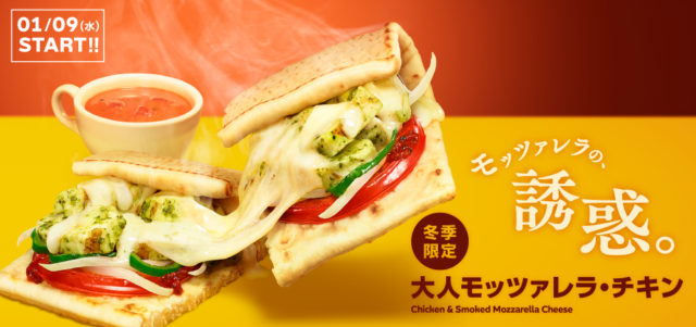 昨シーズン好評を得て今回2回目の販売となる『大人モッツァレラ・チキン』は、燻製モッツァレラチーズ“スカモルツァ・アッフミカータ”を、野菜とボリューミーなバジルチキンに重ねオーブンでトーストした、スモーキーな風味を楽しめるホットサンドメニューです。また、新登場の『天然えびのまろやかビスク』は、天然のえびとトマトの旨味を凝縮したクリーミーで濃厚な味わいのスープです。冷えた身体を温める、この期間限定のホットメニューが楽しめます。