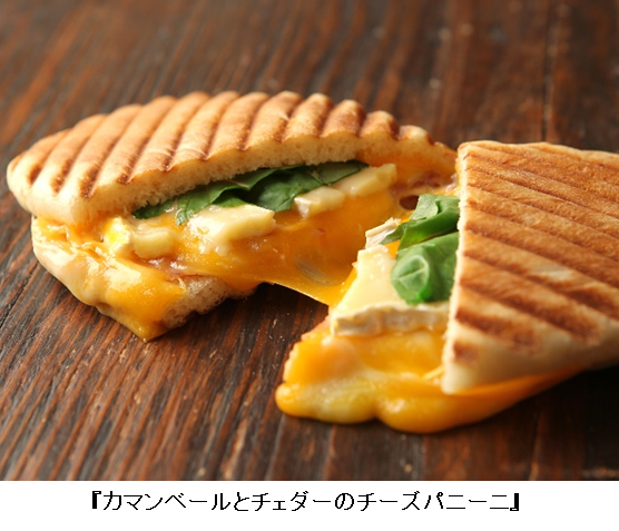 新発売の期間限定メニュー「カマンベールとチェダーのチーズパニーニ」はカマンベールチーズとチェダーチーズをたっぷり使用し、ベーコンとルッコラをトッピングした、この冬おすすめの一品です。アクセントの“ホースラディッシュ&マヨソース”と粗挽き胡椒で味をひきしめ、カマンベールチーズやチェダーチーズの香りとベーコンの旨みを更にひきたてます。オーダーを受けてから焼き上げるパニーニは、出来立てをその場で食べられます。
