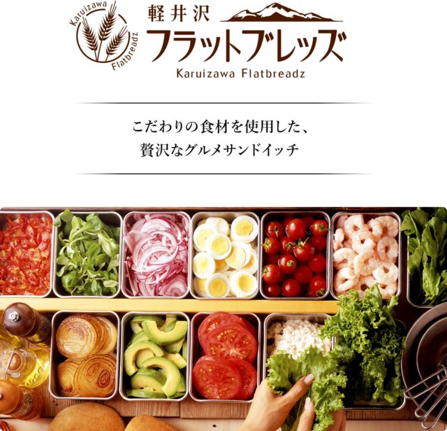 「軽井沢フラットブレッズ」は、軽井沢のパン屋の名店「浅野屋」と共同開発した、焼きたての特製ブレッドに新鮮野菜や厳選した食材をたっぷりと挟んだ、素材が楽しめる贅沢なグルメサンドイッチ専門店です。小麦が香る特製ブレッドは全粒粉ブレッドも選べ、食物繊維・鉄分、ビタミン・ミネラルを手軽に摂取する事ができます。挟む野菜は野菜ソムリエが直接畑に出向きその味を確認して、その時期に本当に美味しい野菜の地域を厳選して使用しています。例えば軽井沢店では地元軽井沢の霧下野菜を毎日農家より直送しています(収穫時期により変更有)。また、肉汁あふれるグリルメニューは浅間山の溶岩石で焼く事で、鉄板では味わえない遠赤外線効果で肉の旨味を逃がさず口の中で驚くほどジューシーな味わいが広がります。全てに