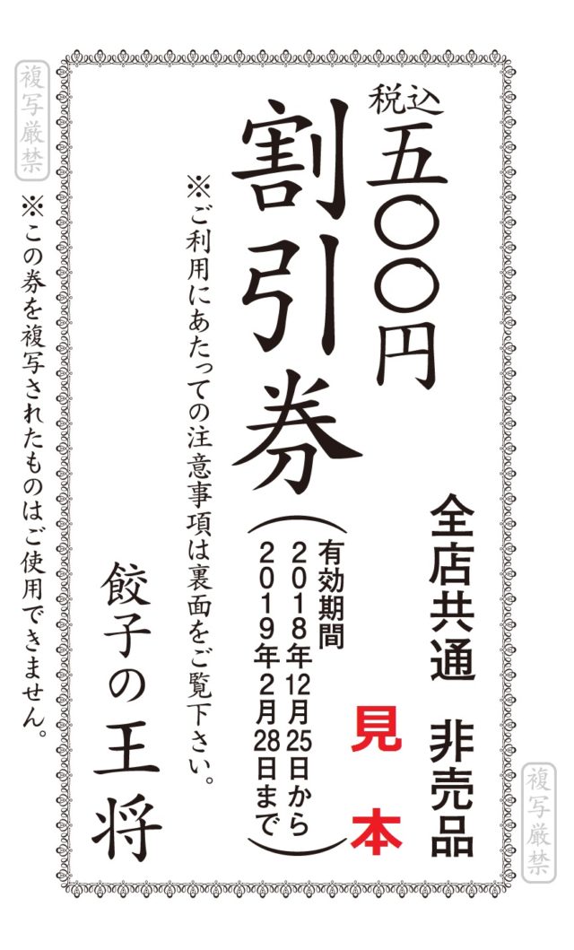 2018年12月24日(月)限定で、店内飲食またはお持ち帰りで店舗を利用したすべてのお客様へ、創業当時の餃子試食券の復刻デザイン版「税込500円割引券」をプレゼントします。