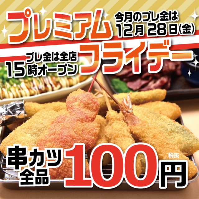 株式会社串カツ田中ホールディングスは、2018年12月28日(金)プレミアムフライデー当日に、串カツ田中ほぼ全店を15時オープンとし、串カツを全品終日108円で提供するキャンペーンを実施します。