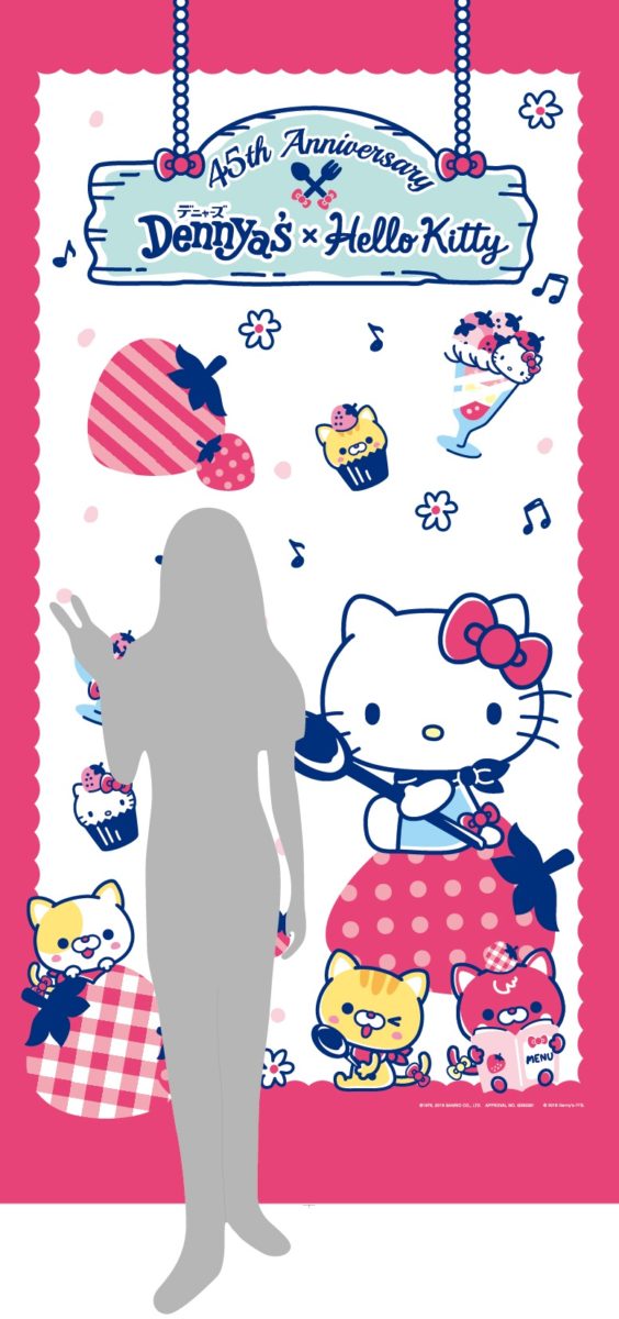 これは、2019年にデニーズとハローキティがともに45周年をむかえることを記念したもので、同日より販売開始するデニーズの苺デザートを、ハローキティの世界観とともに楽しめるようになっています。