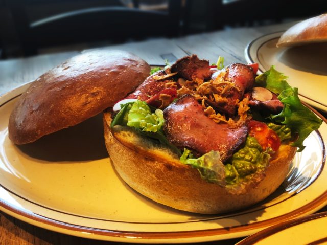 フレッシュなサラダを、メゾンカイザー独自のフランスパン用小麦粉「メゾンカイザートラディショナル」を配合したパンで作った器に盛り、贅沢な霜降りのリブロースをトッピング。トリュフオイル配合のドレッシングを振りかけました。トリュフの香りを存分に堪能できる商品となっています。