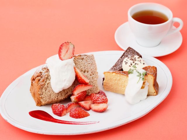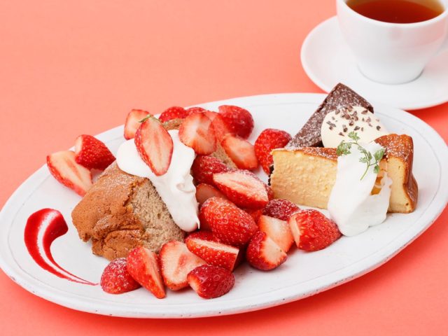 苺たっぷりのストロベリーシフォンケーキに、本日のデザート2種を贅沢にプラスした、3種のデザートがお得に楽しめる期間限定のスペシャルデザートプレートとなっています。