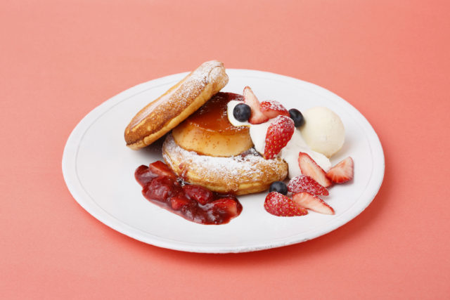 自慢のパンケーキでは、たまごの風味豊かな"焼きプリン"を大胆にトッピングした見ても食べても楽しいハイブリットパンケーキがお目見え。〔プリン×苺×リコッタチーズ〕のハーモニーがクセになる味わいのパンケーキとなっています。