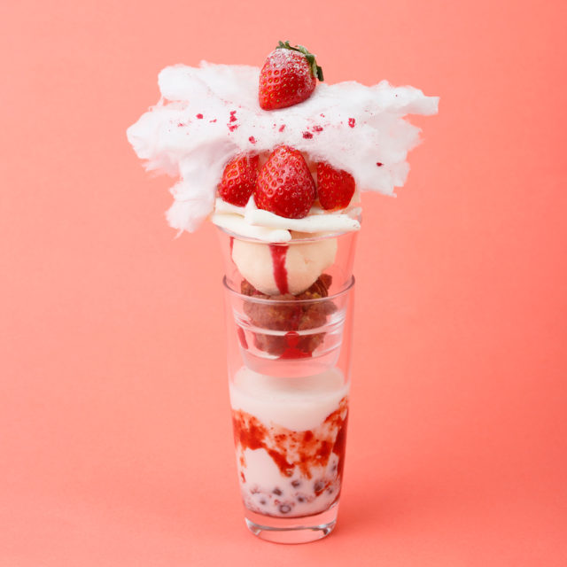 タピオカ苺ミルクドリンクと旬の苺をたっぷりと使って、コットンキャンディーで見た目も華やかなストロベリーパフェ。1品で苺を堪能できる特別デザートのWパフェとなっています。