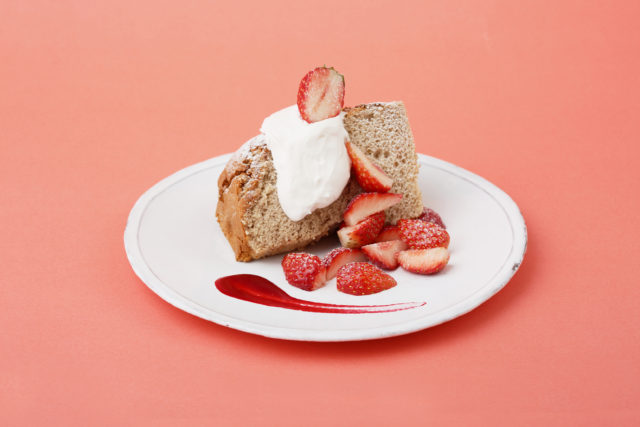 紅茶のシフォンケーキに相性のよいストロベリーとふわふわのクリームを贅沢に盛り付けたデザート。