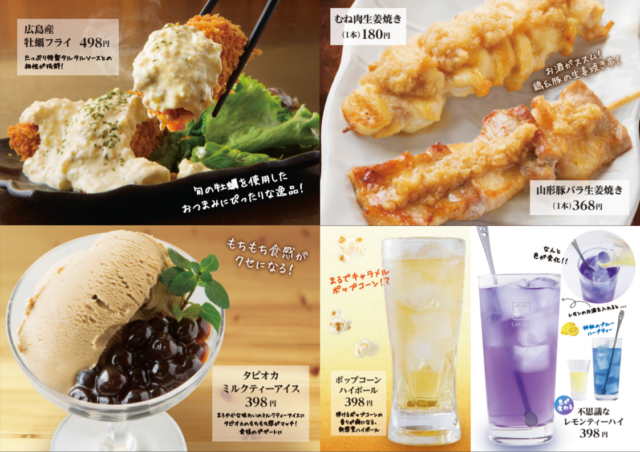 『亀田製菓』とコラボした新メニューと同じタイミングで提供をスタートする期間限定メニュー。特製タルタルソースがたっぷりかかった広島県産の牡蠣を使った「広島県産牡蠣フライ」、生姜がアクセントの「むね肉の生姜焼き」、「山形豚バラ生姜焼き」、トレンドのタピオカを使った「タピオカミルクティーアイス」、色の変化が驚きな「不思議なレモンティーハイ」、まるでキャラメルポップコーンを食べているような味わいの「ポップコーンハイボール」を提供します。
