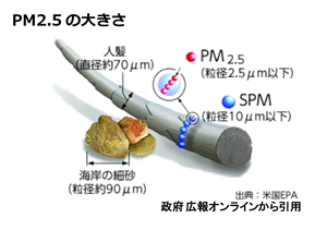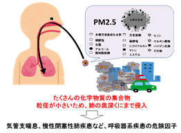 *) PM2.5は、石炭や石油といった化石燃料や薪などのバイオマス燃料、タバコの燃焼などによって生じる2.5μm以下の粒子状の大気汚染物質のことで、非常に粒径が小さいために肺の奥にまで入り込み、細胞を傷つけ酸化ストレスや炎症反応を生じます。PM2.5の吸入は気管支喘息や慢性閉塞性肺疾患(COPD)などの呼吸器系疾患や循環器系疾患などの危険因子と考えられていますが、非常に小さいために、マスクなどで吸入を完全に防ぐことは困難です。