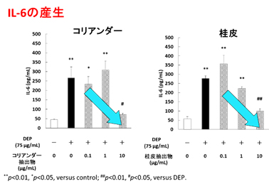 その結果、コリアンダー抽出物と桂皮抽出物にも炎症性サイトカイン産生を抑制する効果が確認されました。これらの結果から、ウコンやクローブ同様、コリアンダーや桂皮も、PM2.5による炎症反応を抑制する可能性があることが分かりました。